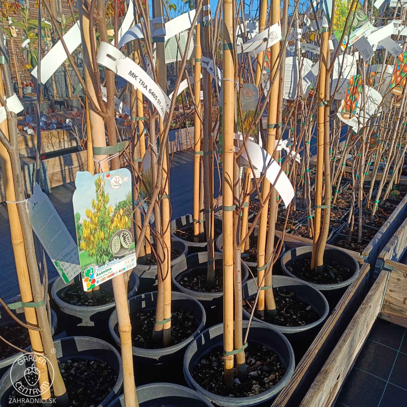 Asimina triloba ‘SUNFLOWER’, známá také jako „indiánský banán“, je odrůda oblíbená pro své chutné, aromatické plody a spolehlivou úrodnost. Jedná se o menší, pomalu rostoucí ovocný strom nebo keř, který dorůstá do výšky přibližně 5 až 6 metrů. Jeho koruna je hustá, nepravidelně oválná a v dospělosti může mít šířku okolo 2,5 – 3 metry. Listy jsou velké, podlouhlé, sytě zelené a na podzim se zbarvují do krásných zlatých až žlutých odstínů.